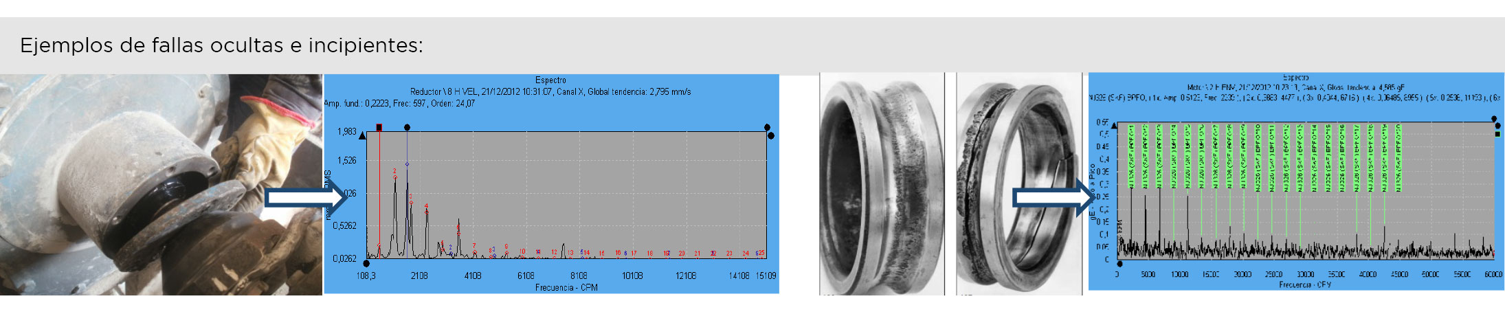 - Detección de daños en rodamientos, cojinetes, engranajes aun en muy bajas rpm. Ej.: soltura, pitting en rodamientos, fallas de engranes.